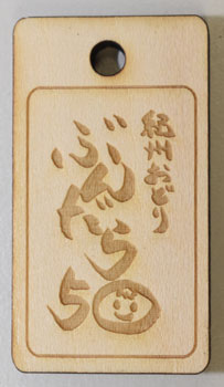 木札は横2・5㌢、縦4・5㌢で、たにさかさんによる「紀州おどりぶんだら50」の文字にみかんの絵を添えたデザイン(写真上)。6月21日には和歌山市西浜の和歌山工業高校の協力を得て、レーザー加工機でベニヤ板に文字を焼き付け、完成させた。