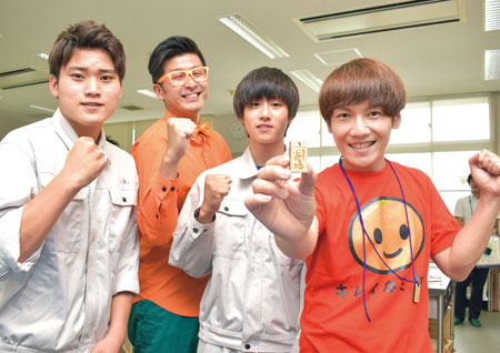 写真=木札をデザインしたたにさかさん(左から2人目)と、まことフィッシングさん(右端)、和工生