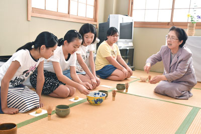6年の辻中陽菜さんと硲汐梨さんは「ずっと正座をするのがつらかったけれど、最後にシャカシャカと泡立てるのが面白かった」と笑顔。指導した橋本さんは「茶道はお茶や人、時間との一生に一度の出会いである一期一会を大切にします。今日のことを忘れず、お辞儀やあいさつがきちんとできる子に育ってほしい」と話している。