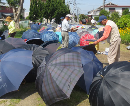 ほっとタウン有功は高齢者の地域福祉に取り組み、11ヵ所でサロンを開く。善意の傘は、六十谷の事務所で月曜午前に開くおしゃべり会のメンバーで、70、80代の15人が昨年秋に始めた。発案したのは、奈良から移り住んだ岸田行弘さん、節子さん夫妻。JR三郷駅で同様の活動がされていたのを思い出し、サロンで相談したのが始まりだ。