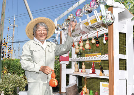 野鳥を木彫りするバードカービングに15年前から打ち込む橋本さん。育てた植物で雑貨を作ろうと、5年前にひょうたん細工を始めた。バードカービングの仲間に配り好評だったため、今年4月に屋台を設置した。