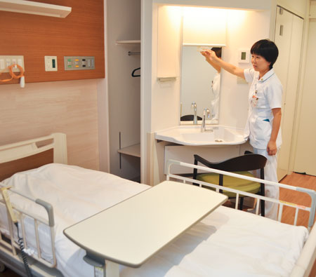 南館13階を改装。20床ある個室は、木目調の落ち着いた雰囲気で、洗面台の鏡は、治療で毛が抜けたり、やせ細った顔を見たくない人のためスクリーンをつけた。家族らと歓談できるデイルームは、名草山から紀伊水道にかけての景色を楽しめ、簡単な調理ができるようキッチンを設けた。