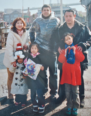 写真上=福本さん(右)と固い握手を交わすズラブさん、同下=14年前、福本さん一家と