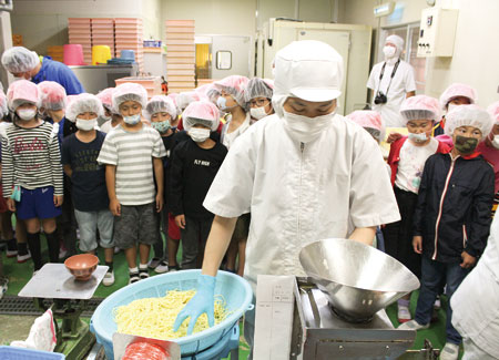 工場では柏木隆夫社長が粉からめんができて、袋詰めされるまでを紹介。児童は興味津々に大きなミキサーや製麺機をのぞき込み、生地がめんになり出てくると歓声を上げた。