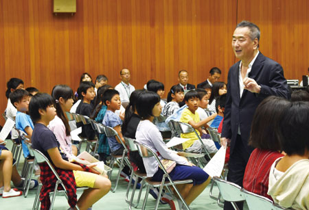 映画音楽やオペラ作品の作曲家、三枝成彰さんが10月10日、和歌山市榎原の木本小学校を訪れ、5、6年生165人にクラシック音楽の歴史や和音の仕組みを解説した。