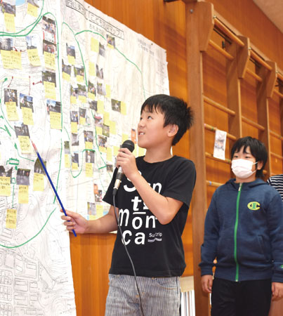 吉礼南コースを調べた窪田日菜さんと山﨑莉鈴さんは「公衆電話が一番役立つと思いました。電柱が倒れかけているところ、山が崩れそうなところがあり、歩いて初めて気付きました」。防災会の川口義晴会長は「中学生になったら、助けられる側から助ける側になれるよう、防災について今から身につけておいてほしい」と目を細めていた。