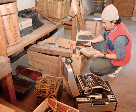 工場内には昭和初期の帳簿の束、事務作業に使ったイタリア製タイプライター、手作業で漆をかき混ぜた棒と、会社にちなんだ物や、レコード、和傘など生活感のあるものも多い。今回はレンガ造りの倉庫に建物の古材を活用した展示スペースを設け並べる。