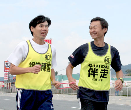 「きずな」と呼ばれるロープを握りあい、伴走者は歩幅を合わせ、コースの状況やタイム、給水場所、他のランナーの急な動きなど安心して走れるよう声をかける。