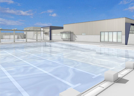 老朽化した堀口プールと東公園プールを統合。屋外に25㍍の大プールと、ウォータースライダーのある中、小プールの3種類を設ける。592㌧の水を1年中ためておき、災害時にはろ過装置で、1300人に1ヵ月間、飲み水を供給する。