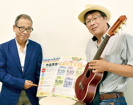歌謡コンサートは、1部で優秀賞に輝いた楽曲や歌手を披露し、4作品からグランプリを投票で決める。2部は古家学さん、羅布陽介さん(写真右)ら県内で活躍する歌手10人が和歌山の眠れる名曲を熱唱する。
