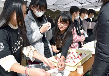 イベント当日は、白玉粉をこねた求肥に黒ごまで目をつけたいちご大福、チョコレートを練り込んだ羊かん、桜や水仙の木型で作った練り切りなど6種類480個を手作りし販売。保護者や地域の人たちが買い求め、1時間で完売した。取り組みを通し、中屋美咲さんは「分量を少し間違えると形にならないなど難しかった。和菓子には色んな種類があると分かり、楽しかった」。