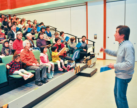 ♪ぞう列車よ急げ 空をかけて走れ♪ 組曲第10番『ぞうれっしゃよ走れ』を元気に歌う2歳~80代の団員。「ハ行ははっきり」「弾みをつけて歌いましょう」と副指揮、佐古雅哉さん(62)の指導で歌声に磨きをかける。
