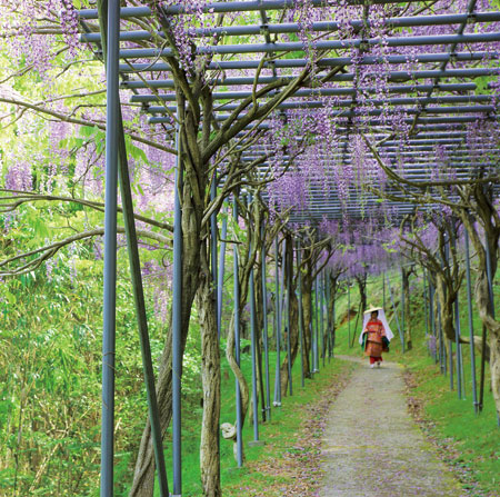 和歌山市から車で約1時間、日高川町初湯川のみやまの里に「日本一長い藤棚」がある。敷地内の藤棚ロードは、長さ1646㍍で日本一。ピンクや紫の花を咲かせる山藤や野田藤、白藤、九尺藤の4種類が約600本あり、見ごろは4月26日㊎~5月上旬の見込みだ。