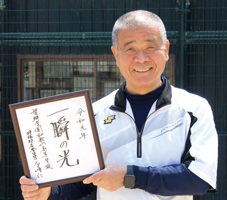 座右の銘のひとつ、「栄光は一瞬、努力は一生」から〝一瞬の光〟としました。卒業生たちに何度も贈った言葉です。スポーツだけでなく、何事においても勝負は一瞬。その瞬間に輝くために、努力は一生し続けないといけない。48年間、高校野球に携わったことで、勝つためにはこの思いが必要だと確信している。これからも伝えていきたい言葉ですね。
