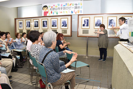 和歌山市役所1階で4月にスタートした手話のミニ講座が好評だ。来庁者に気軽に参加してもらうため、あえて講義室ではなくロビーで開く。障害者支援課の松谷真理さんは「手話が言語だということをもっと広め、市民があいさつ程度できるようになってほしい」と願っている。