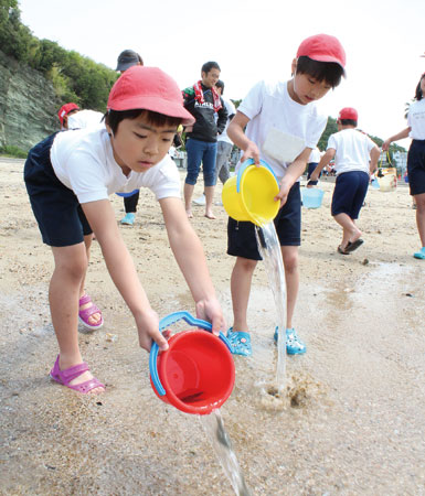 全校児童45人が同市や串本町で育った8~15㌢のマダイ、イサキ、ヒラメの稚魚約2000匹を放流。バケツの中を泳ぐ稚魚をのぞき込み、「小さくてかわいい」「逃がすのがもったいない」と言いながら、海へ送り出した。6年の西山貫太くんは「魚は見るのも食べるのも好き。自分で釣りたい」とにっこり。