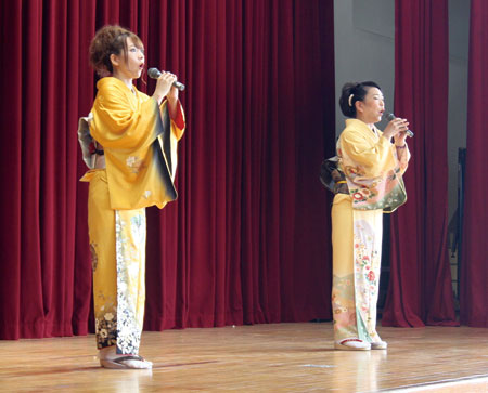 2年後に和歌山で開催される全国高校総合文化祭の出演者を募るため、関西吟詩文化協会の2人が6月21日、和歌山市秋月の日進中学校で詩吟を披露した(写真)。県吟詩連盟の松島南洲理事長は「地元開催の総文祭なので、ぜひ県内の学生に詩吟を詠ってもらいたい」と話している。