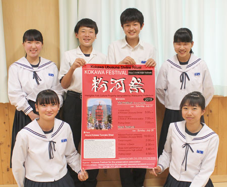 紀州三大祭りの一つで県無形民俗文化財の粉河祭を外国人観光客に知ってもらおうと、紀の川市東大井の打田中学校3年生6人が英訳ポスターを製作した。7月1日から和歌山電鐵貴志駅前や観光特産センターこかわで掲示。メンバーの1人、巽美愉さんは「事前にDVDを見て祭を学びました。英訳は大変だったけど、日本人のおもてなしの心を伝えたい」と笑顔を見せる。