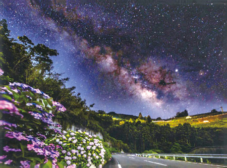 有田川町の道にあじさいが咲き、空には天の川の美しい星々が浮かんでいる写真を撮影したとき、「たくさんの人に見てもらいたい」と、24年ぶりの写真展を思い立った。