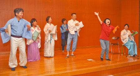 「声は健康のバロメーター」をモットーに、声帯や舌を鍛えるトレーニングを行う。大きな声を出すこともあり、「ストレス解消になると好評です」。昨年の発表会は朗読の合間にベリーダンス教室の生徒が共演し、今年は声以外の表現にもチャレンジしようと、演劇を取り入れた。
