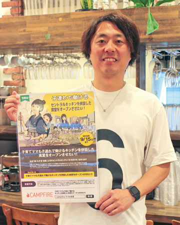 子育て中の母親が子どもと一緒に出勤し、調理の仕事をしながら同じ部屋で過ごせる「襷(たすき)食堂」を、和歌山市で飲食店を経営する奥畑公康さん(写真)が9月15日㊐(予定)、同市十二番丁に開く。同日までインターネットのクラウドファンディングで出資者を募っており、「働きたくても子どもの預け先がなく、仕事を制限されるお母さんたちの働き方改革が必要。預けずに働ける職場をつくりたい」と力を込める。