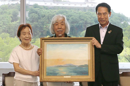 加太の海を見下ろす所に建つ青少年国際交流センターに、和歌山市三葛の洋画家、中尾安希さん(78、写真中央)が8月23日、油彩画「夕陽の友ヶ島」を寄贈した。
