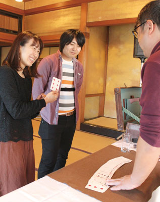 写真=文化祭を間近に控え、手品を見せるメンバー(右)
