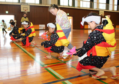 この日、児童らは11月23日㊏に根来寺で行われるかくばん祭での発表に向け、かすりの着物に黄色い帯の衣装を身にまとい、歌に合わせて風車を回すタイミングや、手の振り方などを練習した。小さな人形を背負って踊る2年の田畑真子さんは「着物で踊るのがうれしい。そでをヒラヒラさせるところがお気に入りです」とにっこり。
