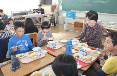 地域で暮らす人を招き、日ごろの感謝を伝えるふれあい給食が11月8日、和歌山市秋月の宮小学校で開かれた。4年の下田穣一朗くんと井上剛輝くんは「一緒に食べた人から、昔はパンと牛乳とおかず1品だったと聞いて興味がわいた。今の給食はおいしいと言ってくれたのがうれしい」と声を弾ませた。