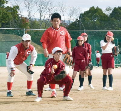 日ごろの応援への感謝と交流を目的に昨年から実施。まず、池田陽佑投手が投球、東妻純平選手が打撃を披露した。この後、柔らかいボールとバットを使い、キャッチボールやバッティングを教えた。アドバイスを受け、最初は空振りや暴投をしていた児童らは短時間で上達していった。