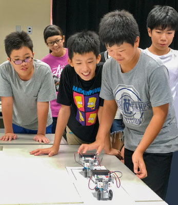 写真=自らプログラミングしたロボットを動かす子どもたち(きのくにICT教育)