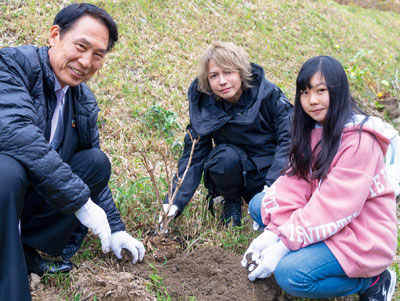 和歌山市出身で同市ふるさと観光大使を務める人気ミュージシャンのHYDEさんが1月14日、地元の森林公園であじさいの苗木を植えた。