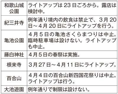 このほか、主なスポットの対応は上表の通り(3月16日現在)。紀三井寺は昨年まで同様、シートを広げての飲食は禁止で、「そぞろ歩きでのお花見を」と話している。