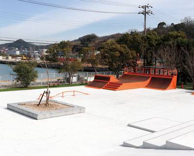 雑賀崎工業団地の球場北側に和歌山県が開設、県スケートボード協会が監修した。約1000平方㍍の場内に、街中をイメージした花壇型や、観客席にもなる階段型など7基の障害物を配置。初心者が練習できるよう平坦なスペースも設けている。