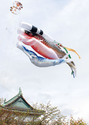 5月5日のこどもの日を前に、4月20日から和歌山城天守閣の中庭で、大空を気持ちよさそうに泳ぐ鯉のぼり。今年は和歌山市本町の老舗人形専門店をぐらやが寄贈した鯉のぼりが揚げられた。