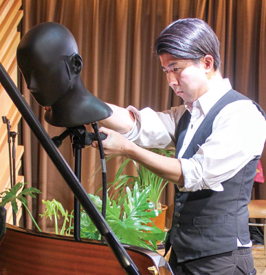 人の頭部の形をした特殊なマイクを使い、実際に耳で音を聞く時に加わる反響や空気抵抗を録音するシステム。楽器の音だけでなく、その場の呼吸や歓声、ノイズまで録れるため、ヘッドホンで聞くと、ライブ会場にいるような感覚を、どこにいても体験できる。