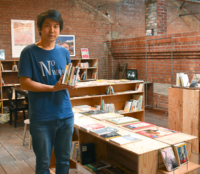 昭和初期から残るレンガ製の壁に囲まれた空間に、年代もののショーケースや手作りした棚を設置。1960年代のアメリカ文化に関連した本のほか、アートや旅本をメーンに、料理本、絵本などが並ぶ。「平易な本や写真集、旅本などビジュアル本が中心なので、普段本を読まない人の導入にぴったり。多様な価値観に触れてもらい、読んだ人のこれから生きていく世界が広がれば」と笑みをこぼす。
