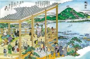江戸時代の地誌書『紀伊国名所図会』には、西国巡礼の人や庶民がくつろぐ様子が描かれ(写真下)、和歌山市立博物館元館長の額田雅裕さんは「そもそも風景を眺めるために造った所。近くに紀三井寺側へ渡る船着き場があり、ターミナル的な場としてにぎわいがありました」と語る。