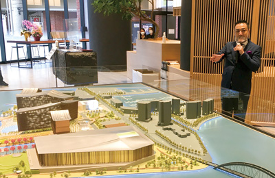 マカオに本拠地を構え、アジアで複数のカジノ関連事業を手掛けるサンシティグループホールディングスの日本法人。事務所では、IRの施設模型やコンセプト動画を公開し、カフェや市民が使えるコミュニティスペースを設けた。