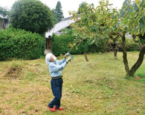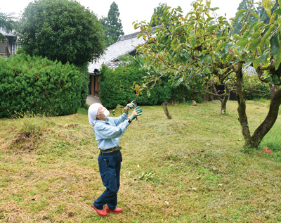 写真=古民家隣りの柿畑で手入れする田中さん