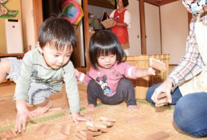 この日はまず、那賀振興局林務課の片畑万季さんが「木は家の柱やおもちゃになる身近な存在。木を大切にしてください」と説明。園児たちは歓声をあげ、ドミノや家を作ったり、肉に見立ててままごとをしたりと楽しんでいた。加藤美樹子園長は「子どもたちは木が大好き。つみ木で遊ぶことで自然の中にいるのと同じ感覚を室内で体験できるのが良いですね」とにっこり。