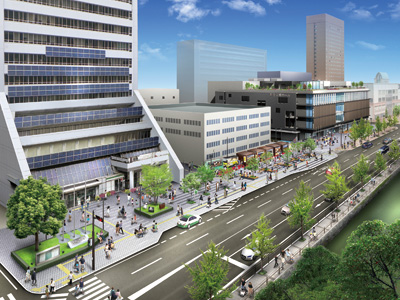和歌山城天守閣を望む広場にケヤキを植え、周りに紀州材のベンチを置く。歩道は2・5㍍から5・5㍍へ。食べ歩きを楽しめるよう飲食店やキッチンカーを誘致し、小規模イベントを開く。