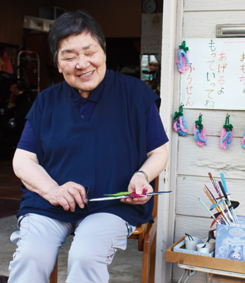 南海和歌山市駅近くの駐輪場前に、手裏剣や刀の折り紙を並べているのは中村千里さん。10年前、くも膜下出血のため両目が見えなくなってしまいました。ある日、娘から折り紙をすすめられ挑戦してみると、元々指先が器用だったからか、スイスイと折り鶴ができました。「楽しくて、たまに来るひ孫と一緒に折っていました」。作品は子どもたちが自由に持ち帰れるよう、駐輪場の前に置いています。