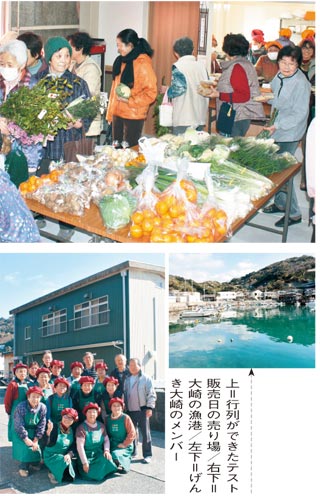 1月のテスト販売では鮮魚に釜揚げひじきのほか、海老コロッケ、サワラの天ぷらの総菜、みかんや金柑など大崎の特産品を並べ、開店前から行列ができた。訪れた大崎の78歳女性は「一人暮らしの高齢者はおかずを作るのも大変で総菜は助かる」、和歌山市から来た上木直人さんは「初めて来たが、鮮魚の料理法を丁寧に教えてくれ、アットホームで良い所。2月14日のオープンが待ち遠しい」と語る。