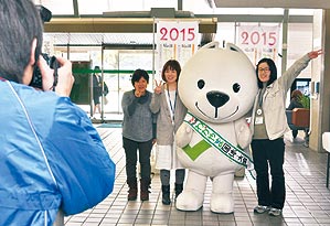 紀の国わかやま国体の開会式222日前を迎えた2月16日、国体マスコットキャラクターのきいちゃんと市民222人がピースサインで撮影した写真をあしらったポスターを作成するため、新南保育所と和歌山市役所、中保健所の3ヵ所で撮影会が開かれた。