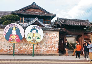 実行委は、池田さんはじめ地元主婦や商店主ら女性12人で昨年9月に結成。これまで海南のひなめぐり実行委を招いての勉強会や、淡嶋神社を訪問し、人形の提供を呼びかけて飾ってくれる店を探すなど準備を進めてきた。粉河らしさを持たせようと、毎年7月の粉河祭で使う大うちわとほぼ同じ、直径約2㍍のうちわを製作し、お内裏(だいり)様とお雛様を描いた(写真右下〈携帯などは下〉)。