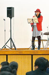 脳出血から奇跡の復活を果たした和歌山市のジャズシンガー、さつきさんが2月16日、同市秋月の日進中学校を訪れ、1、2年生約500人を前に歌声を披露した(写真)。