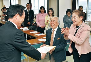 和歌山市が建て替えを検討している市民会館について、文化活動に取り組む個人や団体でつくる「和歌山市民会館について考える会」が4月14日、尾花正啓市長に要望書を提出した(写真)。同会世話人の1人、神崎務さんは「今の市民会館のように和歌山の文化を育てる館であってほしいとの願いで要望を出しました。市民が文化を享受し、発信できる日本一の館になれば」と望んでいる。
