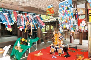 同市で2月と3月に開かれる「紀州海南ひなめぐり」の会場になっている同神社。訪れた男の子から「ひなまつりは女の子の祭りやしなあ…」との声が聞かれたのを受け、近隣の子どもたちとその保護者の協力を得て、昨年からこどもの日の前にかぶと飾りと鯉のぼりを展示している。