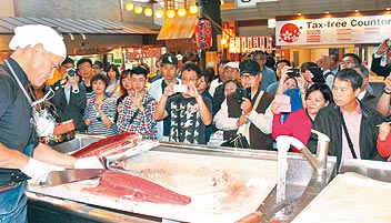 マリーナシティの黒潮市場、人気のマグロ解体ショー。職人がさばき始めると、カメラや携帯電話を手にした台湾や香港からのツアー客が続々と集まる。団体旅行で訪れた台湾のチン・インツーさんは「日本の市場や地方を知りたくて和歌山に来ました。こんなに大きなマグロを見たのは初めて」と笑顔。チンさんのツアーは5日間で大阪、京都、奈良、和歌山を巡る。この日は和歌山城と黒潮市場を見学後、みなべ町の温泉付きホテルへ出発した。